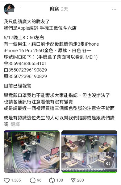 近日有關網路社群流傳影片,有手機店員報案稱有犯嫌趁隙竊取店內手機3支,斗六分局說明案情。