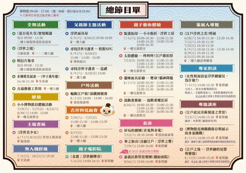 「2025夏日親子藝術月—浮世藝想曲」即日起至8月31日止,活動期間憑當日門票可兌換限量「藝想浮世繪小卡」,共有三款,值得收藏。這場夏日豐富盛典,從解謎到看戲、從展廳到戶外、從白天到夜間,都準備好提供親子滿滿的驚喜與回憶。全系列活動歡迎上官網或臉書專頁查詢。