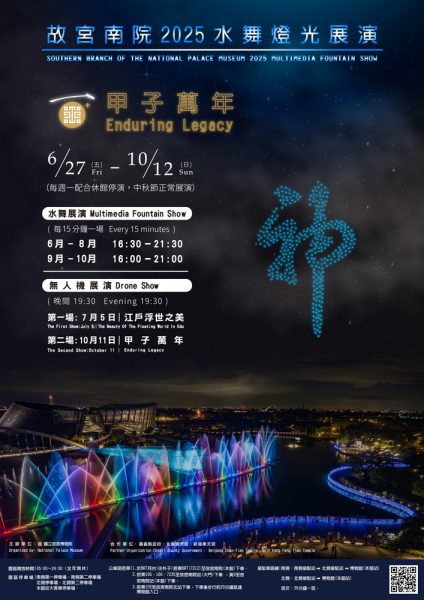 下午4:30起,故宮南院湖面夢幻舞台開始,打造驚豔的「江戶浮世之美」及鎮院國寶水舞秀!飛泉水幕上除有〈翠玉白菜〉、〈毛公鼎〉、〈肉形石〉、〈快雪時晴帖〉、〈定窯 白瓷嬰兒枕〉、〈霽青描金游魚轉心瓶〉等人氣國寶外,浮世繪大師葛飾北齋的黑富士〈山下白雨〉,及今年11月預計現身南院的鎮院國寶〈谿山行旅〉、〈早春圖〉及〈萬壑松風〉,都現身水幕上。水舞配樂特地邀請入圍台北電影獎的音樂人吳沛綾擔任編曲,開館日天天演出,視聽覺感官享受充值滿滿。