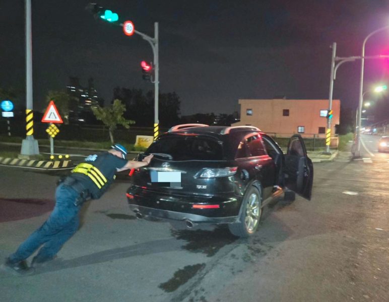 所幸警方即時出現,主動協助民眾合力將車輛移置至安全路旁,避免造成交通阻礙與潛在危險,並提醒蔡民待天亮後再聯繫修車廠協助處理。