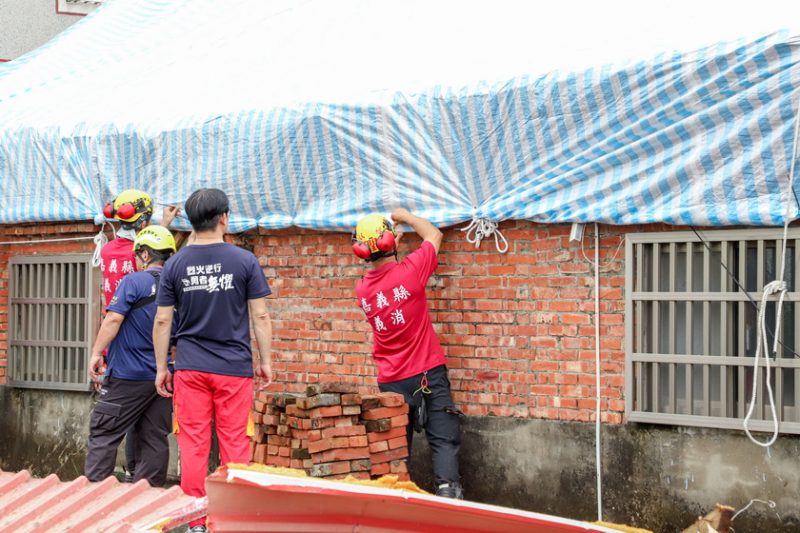 嘉義縣消防局表示,經各鄉鎮市公所提報,截至今日縣內急需協助加蓋帆布的住戶超過300戶,消防局聯合義消優先協助行動不便、獨居長者的弱勢家戶,除了實地勘查屋況,也在屋頂覆蓋帆布,預防連日降雨造成二次災害,嘉義縣汽車修理業職業工會也捐贈156顆報廢輪胎協助固定帆布。