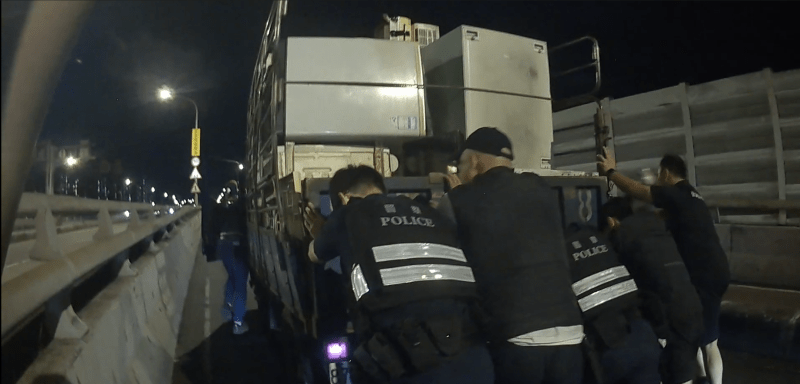 3名警力只得一起推動該車,後面堵住的一部台北客運公車司機見員警推車相當吃力,也立即下車上前幫忙推動該拋錨貨車,該車雖滿載著重物,但因是在上波路段,在眾人協力合作下很快速的被推上橋面不影響交通的位置等待拖吊車到達排除。