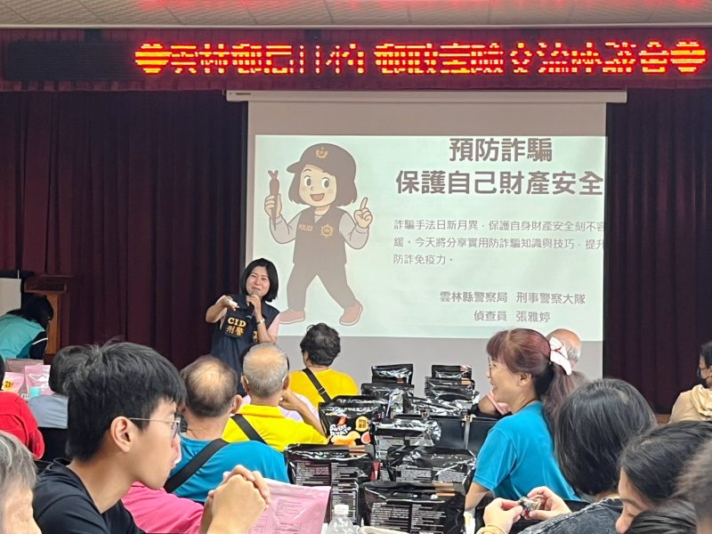 宣導內容提供假投資、網路購物詐騙等詐騙手法,並分享近期警郵合作阻詐案例,提醒民眾面對詐騙團之話術,務必提高警覺,該案例係雲林某郵局發現一名婦人欲提領大額現金,行員察覺有異,立即通報警方趕抵現場協助。該名林姓婦人(40年次)聲稱要裝修自家鐵皮屋,並準備與友人參加8月的美國團體旅遊,因此急需提領新台幣70萬元。然警方與郵局人員深入關心後發現,林婦無法清楚說出材料行、估價單、施工人資訊,甚至連旅行社名稱與行程也都語焉不詳。