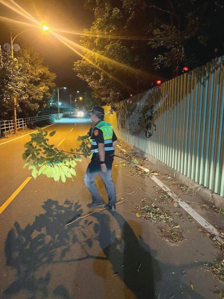 林員第一時間將警車停妥,並在斷枝前後迅速擺設交通錐,建立臨時安全警戒區,提醒後方來車減速慢行。在確保現場警示措施完備後,他與實習生吳凱蚝同心協力,徒手將沉重的斷枝奮力搬移至路旁,為用路人清出安全的車道。