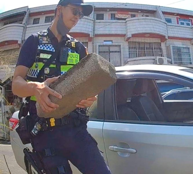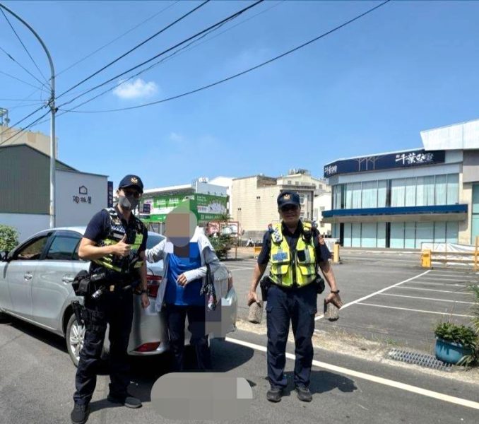 巡佐葉炳男與警員蔡旻諭獲報後火速到場,見老婦人滿臉焦急地站在車旁,車輪深陷於高低落差的溝渠中,無法自行脫困。兩員先嘗試協助駕駛發動車輛,但因輪胎不斷空轉,始終無法移動。所幸兩人未因此放棄,反而四處尋找合適的工具,最終以磚塊墊入車輪下方,並合力推動車輛,在酷熱豔陽下揮汗奮力,終於成功讓拋錨車輛重返道路。老婦人見狀欣喜不已,頻頻向警方道謝,感激之情溢於言表。