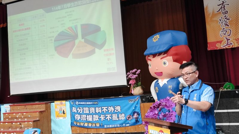 現場有北港農工校長林孟郁、學務主任邱騰輝及學生650名共同參與,展現警察局與學校齊心守護青少年的決心。警察局在記者會中向全校師生報告「打詐儀錶板」、「分析本縣詐欺現況」及「各類詐騙手法」等相關資訊。資料顯示雲林縣統計7月數據,詐騙受理數305件(占全國總受理數1.85%),財損數1億947萬元(占全國總財損1.28%);以每十萬人口數統計,雲林縣7月平均受理詐欺案42.67件(不含外島19縣市最低),平均財損1,660萬(不含外島19縣市第3低)均低於全國平均值(資料來源165打詐儀錶板),也較6月略微呈下降趨勢。