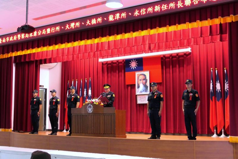 永康警分局於9月1日上午10時30分在分局五樓禮堂舉行鹽行、大灣、大橋、龍潭及永信所等5位新任所長聯合布達典禮,由分局長洪宏榮親自主持,場面隆重 包含永康區朱正軒議員、黃肇輝議員、楊中成議員以及各議員秘書代表,另永康區區長李皇興、永康警友會主任洪德勝、警友顧問團團長徐緯杰、義警中隊副中隊長李順忠、民防中隊長王雲慶、巡守中隊長副中隊長陳添旺、志工中隊長包惠昌,以及該5所轄區里長、義警、民防等警察五力幹部,均到場觀禮及祝賀。