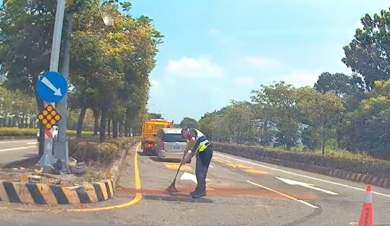 到場時,事故車輛駕駛已送醫。所長許志仰指示值班警員王丁立聯絡拖吊車並準備吸油材料,並由所長於現場清理油污,仔細處理事故地面,同時指揮過往車輛安全通行。陽光炙熱,汗水不斷從額頭滑落,但所長仍專注維持現場秩序,耗費相當時間完成清理。