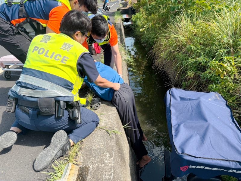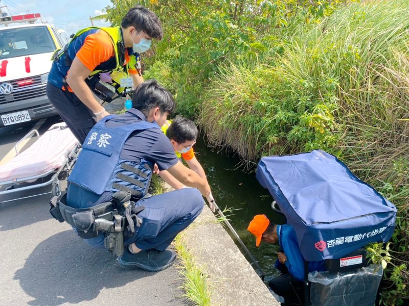 雲林縣口湖鄉9月9日發生一起意外,一名高齡老翁騎乘醫療代步車時不慎跌落水溝,受困其中動彈不得,所幸警方與消防人員及時趕抵現場合力救援,成功將人救起送醫,避免憾事發生。