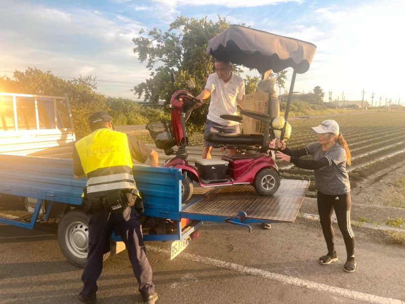 隨後警方先以小貨車將輔助車送回住處,再由巡邏車將蔡翁安全載送返家,並由海埔村長莊國豐聯繫其子女到場照料。