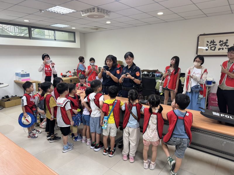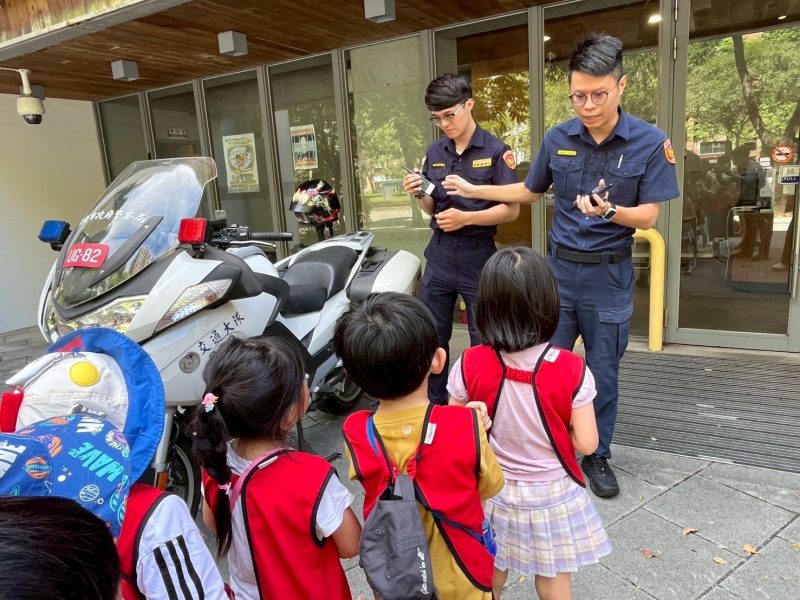 「小朋友們有看過警察叔叔平常上班的地方嗎?」北大派出所所長李勁緯親自接待介紹派出所環境,並由警員陳明媛、郭子寧逐項說明警用裝備,讓小朋友親身體驗警察日常執勤所使用的器材,並強調「遇事勇敢撥打110」的重要性。交通分隊警員向恩煒則展示大型警用重機,講解鳴笛與警示燈的使用方式,並教導行人過馬路的安全要領。