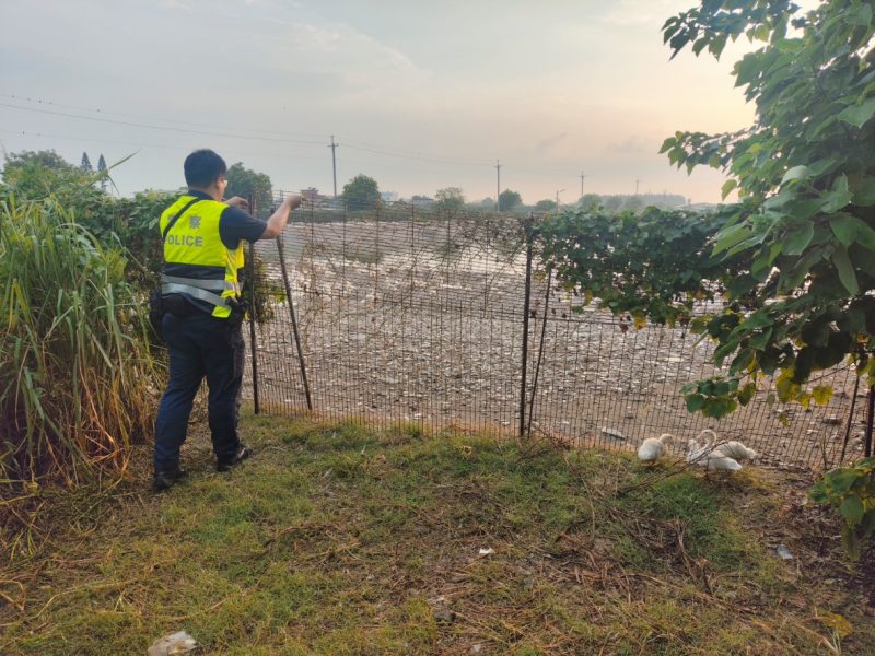 警備隊副隊長林鑫利及斗南所警員張景堯抵達現場時,發現防汛道路旁的養鴨場圍籬倒塌,一群白鴨趁機大逃亡並在防汛道路溜搭,員警擔心車輛為閃避鴨群而發生交通意外,遂趕緊將鴨群趕回養鴨場。