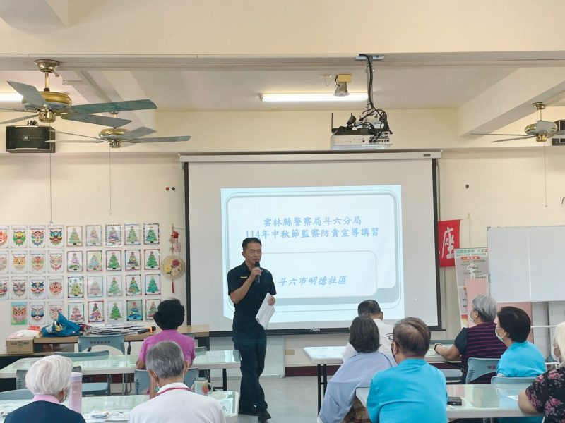 中秋節將至,雲林縣警察局斗六分局為落實114年秋節監察防貪專案,日前由第二組組長丁聰編與第五組組長何圳生率員,前往斗六市明德社區發展協會進行防貪、交通安全、婦幼保護及防詐騙等多項宣導。