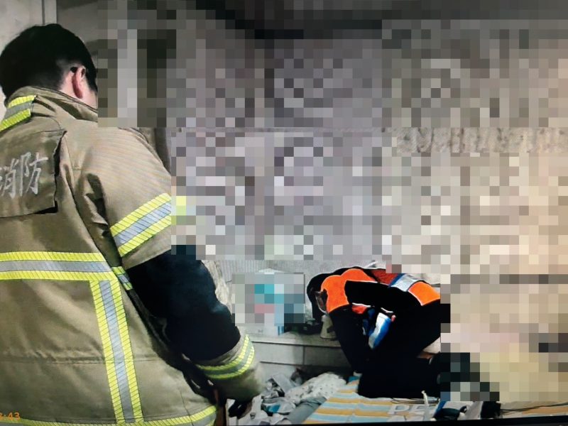 報案人方姓女子向員警表示,她外出2天後返家,發現雖然能用鑰匙開啟大門的鎖頭,但門卻無法推開,研判屋內的大門內鎖已被鎖上;由於家中高齡90歲且患病及失智的母親獨自在屋內,員警不斷拍打門窗和呼喊,但都無人回應,方姓女子焦急地表示母親一定在屋內,擔心發生危險;考量情況緊急,員警立即通知消防及救護人員到場支援救護,消防人員到場後,第一時間執行破門作業進入屋內,發現老婦人所在的房間門竟也緊閉上鎖,為把握搶救時間,消防人員再次破門進入房間。