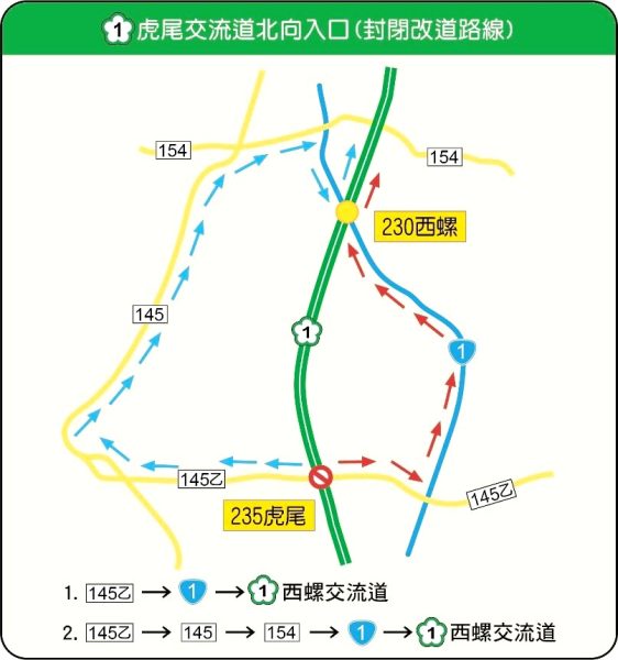 為維護國道主線車流順暢,交通部高速公路局於中秋節連續假期間將視主線交通狀況不定時實施入口匝道儀控管制,並於10月5日(星期日)、 10月6日(星期一)兩日12時起至21時止封閉國道1號虎尾交流道北上匝道入口,民眾如欲於上述時段由虎尾交流道北上,請改由縣道145乙線斗六聯絡道、145線、154線、台1線等替代道路接西螺交流道北上。