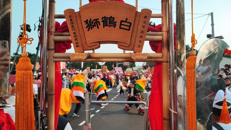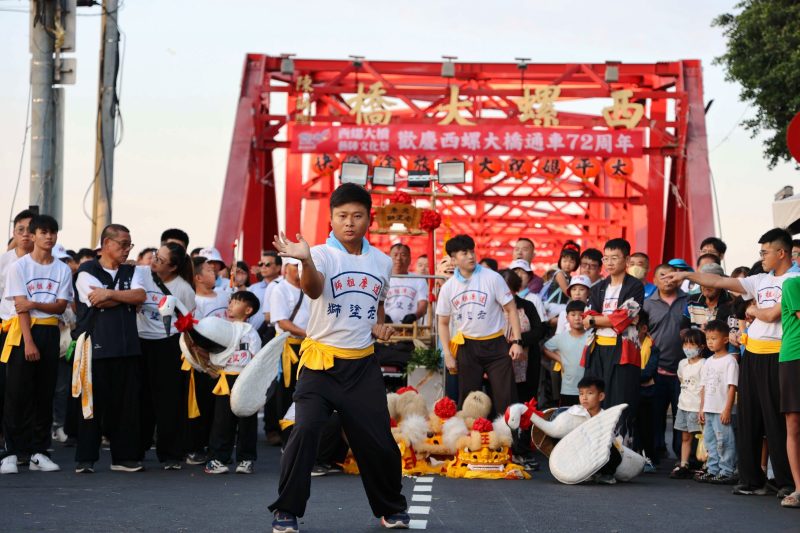 當日下午,大橋草坪上一連串小丑互動秀、泡泡秀及活力健康操營造出溫馨熱鬧的親子氛圍,吸引許多家長帶著孩子踴躍參與。晚間活動高潮接連不斷,首先,由北港老塗獅帶來最具獨特的「白鶴獅陣」表演揭開序幕,象徵迎神入境、護佑地方。