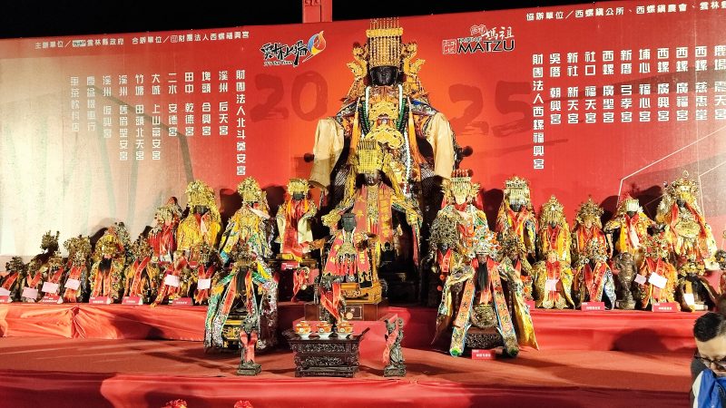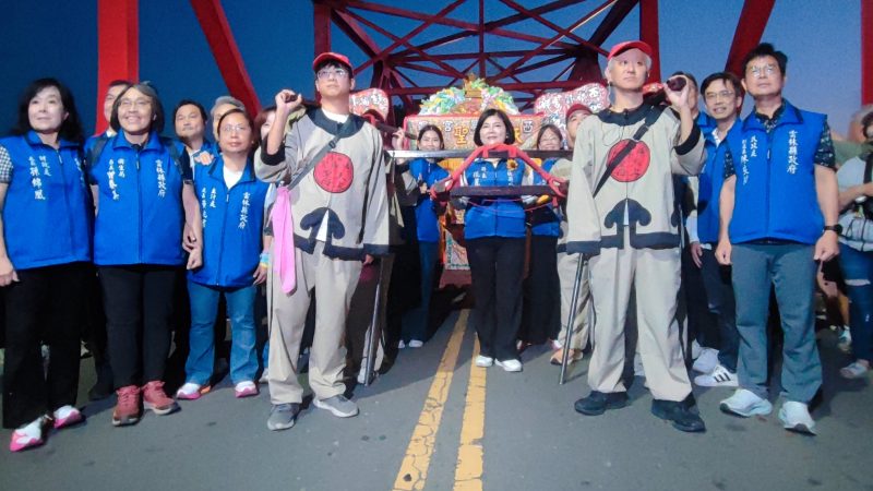 接續登場的西螺福興宮陣頭大軍從頭旗、太子團、彌勒團、神童團、將軍團、哨角團,共逾300位福興宮成員,加上雲林、彰化近30間宮廟參與,逾千人沿橋前進,鼓聲震天、旌旗飛舞,展現雲林信仰文化的壯闊能量。