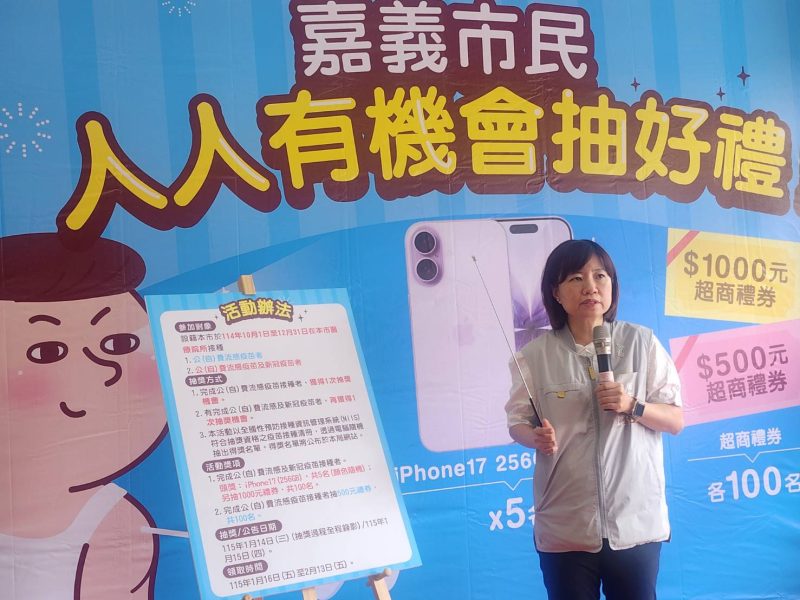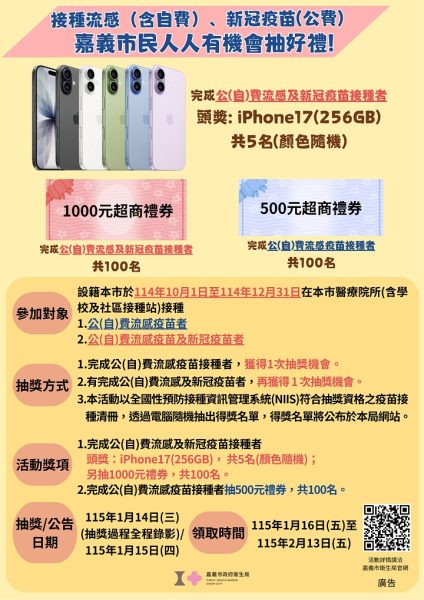 嘉義市衛生局廖育瑋局長說明,設籍嘉義市市民於114年10月1日至114年12月31日期間,在本市醫療院所(含學校及社區接種站)接種公(自)費流感疫苗及新冠疫苗者最多可獲得2次抽獎機會。完成公(自)費流感疫苗接種者,可獲得500元超商禮券1次抽獎機會,共100個名額;若在活動期間,完成公(自)費流感及新冠疫苗接種者,可再獲得1次抽獎機會,頭獎為iPhone 17手機共5名(顏色隨機),未獲頭獎的民眾可再抽1,000元超商禮券共100名。今年度民眾接種疫苗情形相當踴躍,呼籲符合公費資格且尚未接種之民眾,儘速前往疫苗合約醫療院所接種,不僅獲得免疫保護力,還有豐富大獎等著您。