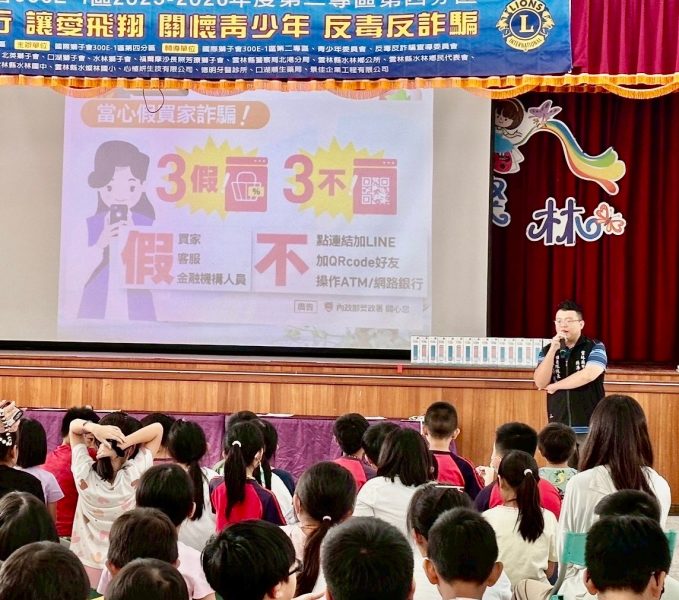 11月6日(星期四)下午,國際獅子會300E1區第二專區第四分區主席郭惠蘭女士帶領獅兄姐,於水林鄉水燦林國小舉辦「反毒、反詐騙」宣導活動。