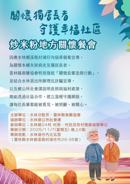 近期長者走失的問題逐漸增加,為了關懷長者並提高社區居民對詐騙風險的警覺,雲林縣警察局北港分局水林聯合所聯合雲林縣救難協會與水林鄉公所社會課,於11月7日晚間在溪墘村湖仔內北玄宮廟埕舉辦了「關懷長輩造冊行動」活動,並結合炒米粉地方關懷餐會。