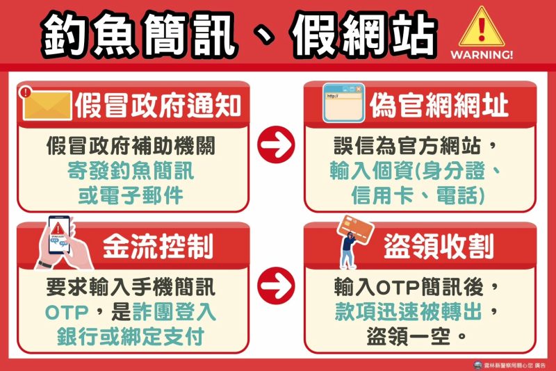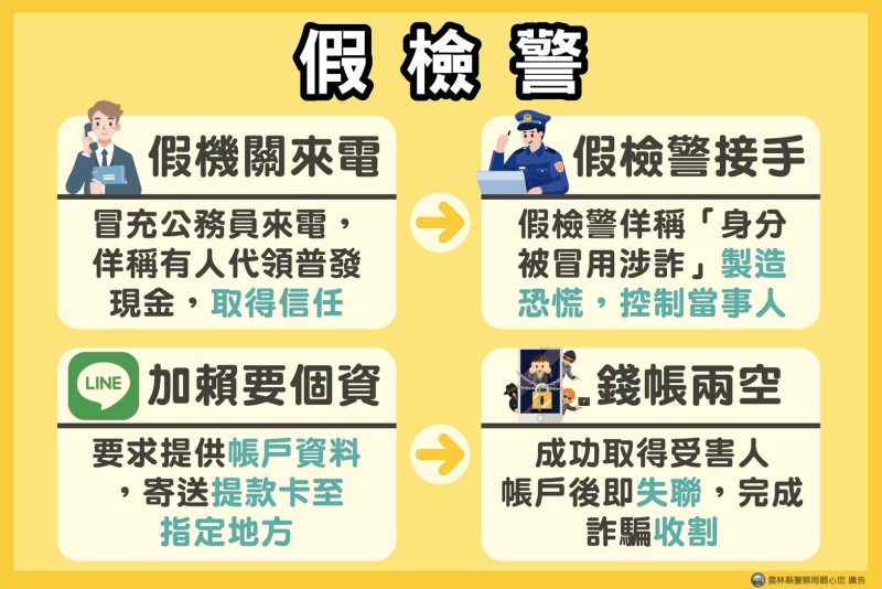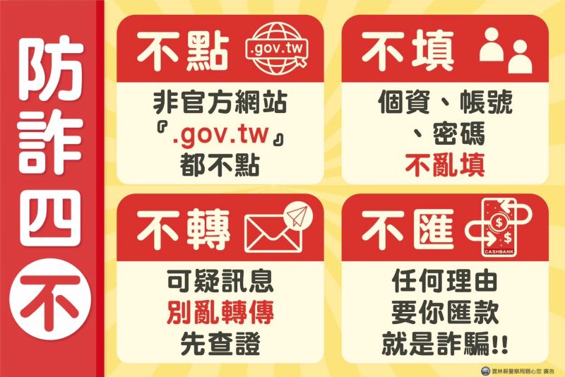 雲林縣警察局呼籲,請民眾一定要記得普發一萬「假檢警」、「釣魚簡訊、假網站」之詐騙手法及「防詐四不原則」,若接獲可疑訊息或來電,務必保持冷靜、勿輕信,可撥打165反詐騙專線或110報案查證,讓詐騙無所遁形,共同守護鄉親荷包安全。