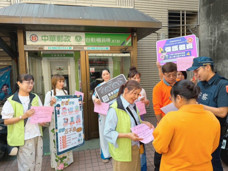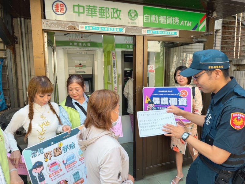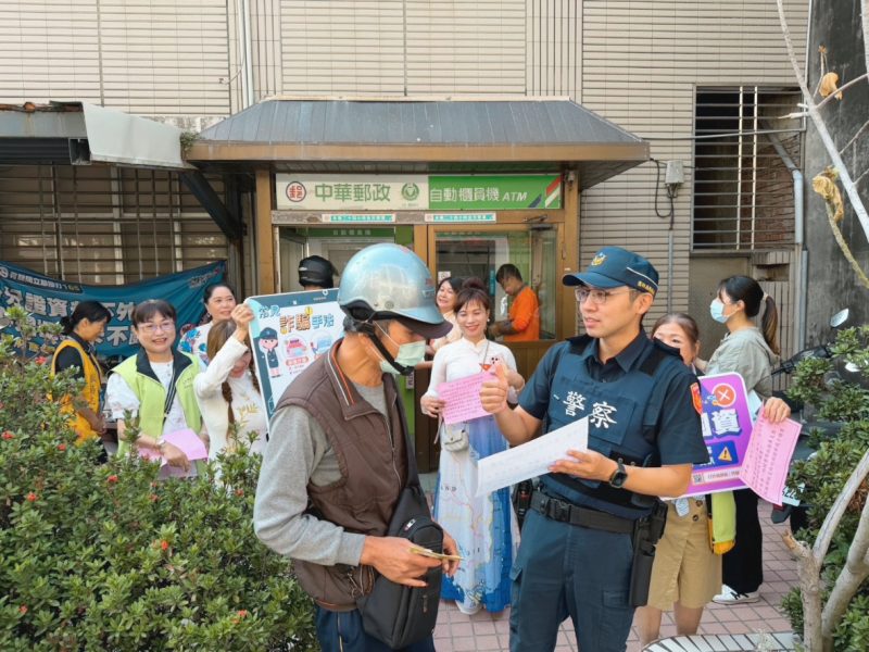 17日上午,臺西派出所所長吳宇謙率領所內同仁與警察志工來到郵局,拿著宣導標語與自製小海報宣導防詐騙。