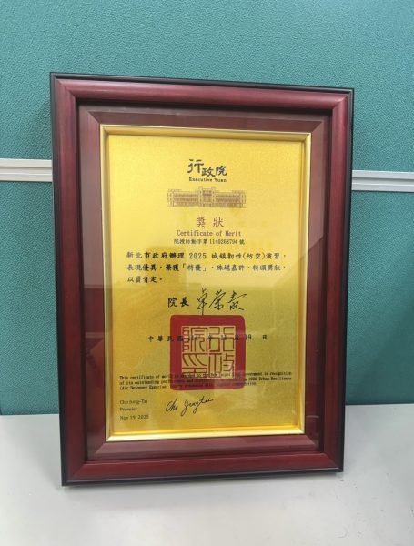 新北市政府警察局統籌辦理首次「2025城鎮韌性(防空)演習」,在市府全力支持與市民高度配合下,展現面對新興安全威脅的整體韌性與全民防衛動員能量。本演習新制首次辦理即獲評全國特優等第,更由行政院長卓院長親自頒獎,警察局於今(17)日特別將這份獎座及榮耀獻給最支持防衛動員工作的市長及全體市府團隊。