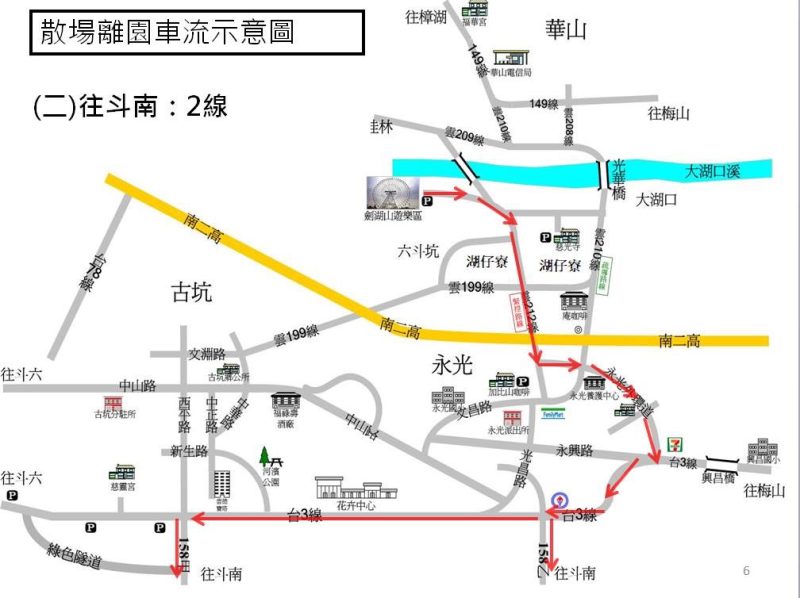 分局長林文智表示,當日欲前往劍湖山世界參加跨年活動的遊客,請提前於上午時段入園,以避開交通壅塞尖峰時段;另為疏導跨年活動結束後散場車流,發布往斗六市、斗南鎮及梅山鄉等替代道路交通疏導圖於斗南分局網頁及社群媒體,提供遊客隨時參考利用,請駕駛人多一份耐心,並聽從現場警察人員指揮及管制,快快樂樂出門,平平安安回家。
