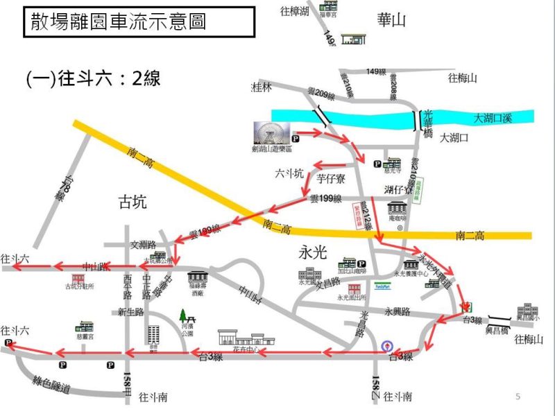 二、劍湖山世界園區內預估可容納自小客車2,505輛、機車2,000輛,待園區車位停滿後,即由警方管制疏(引)導往台3線、永光外環道及古坑鄉中山路等周邊道路適當地點停放。