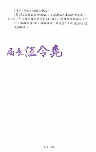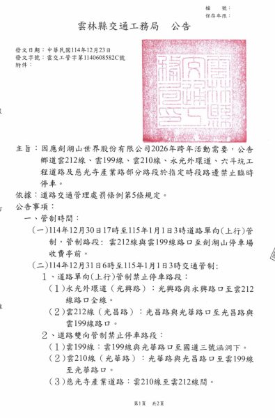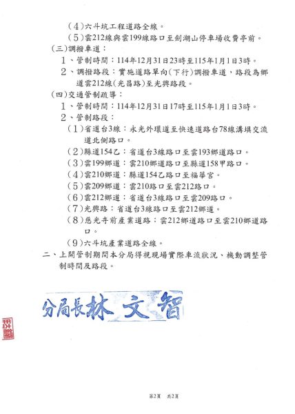 五、為加速跨年活動結束後散場速度,本分局於31日23時起,實施道路單向(下行)調撥車道,調撥路段為鄉道雲212線(光昌路)至光興路段。