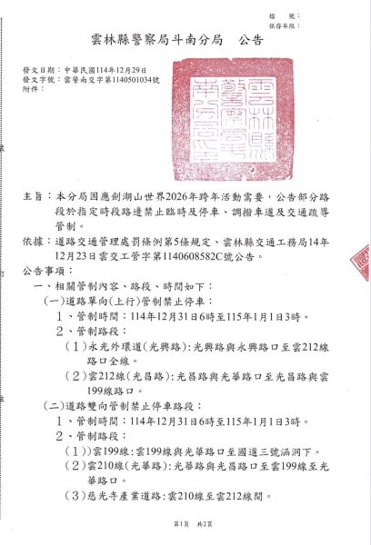一、自114年12月31日上午6時起至115年1月1日凌晨3時止,管制劍湖山世界園區外各主要道路交通疏導。