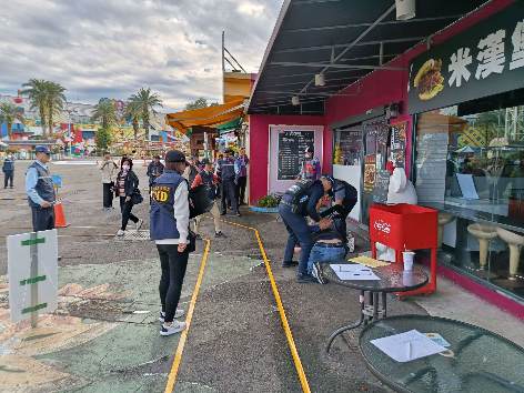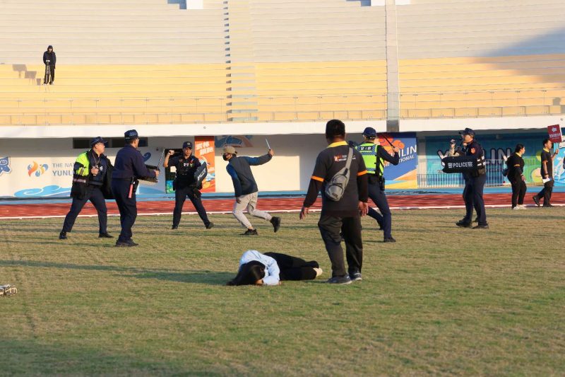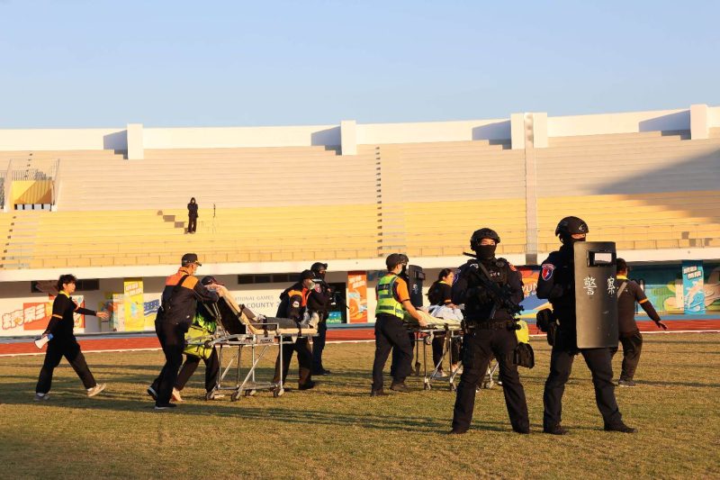警察局接獲通報,立即出動小區安維組到場,男子不聽制止與警方僵持,在帶隊官口令下,警方立即採取行動,以優勢警力將歹徒制伏並上銬逮捕,帶返警察分局偵辦,現場由特殊警力持長槍接續維安警戒。而因緊急事故導致人員躁動發生推擠,計有5名現場民眾擦挫傷。經警方派員管制傷病患現場並確認安全後,通知現場衛生局醫護站人員及消防局派遣救護人員至現場檢傷病患並進行緊急處置,計中傷2名、輕傷3名,經初步處置後,中傷2名由待命救護車及消防局救護車後送就近醫院治療,輕傷3名傷口處理及登錄相關資訊後自行離開,演練過程緊湊、情境逼真。喚醒文觀、警察、消防、衛生及醫療等相關單位的警戒及做好相關的準備。
