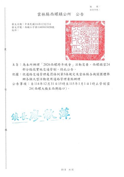 西螺分局提醒,目前西螺大橋因工程施工,自114年12月1日起至116年1月4日止實施封橋管制,另雲24線於114年12月31日15時至115年1月1日亦同步封閉,請民眾行前務必留意相關交通資訊,提早規劃行程並改道行駛,以避免延誤行程或造成交通壅塞。此外,因應近期隨機攻擊事件引發社會關注,西螺分局表示,活動當天將密切掌握人潮流動情形,若發現特定區域人潮快速聚集或密度升高,將即時調整警力部署,加強重點區域巡邏與安全維護,確保突發狀況能在第一時間妥善因應。警方也呼籲民眾務必配合各項交通與安全管制措施,共同維護活動順利進行。