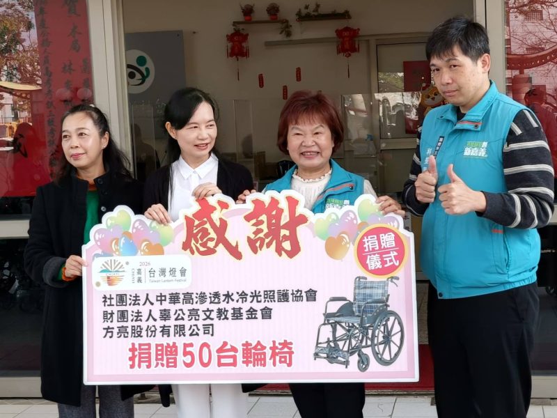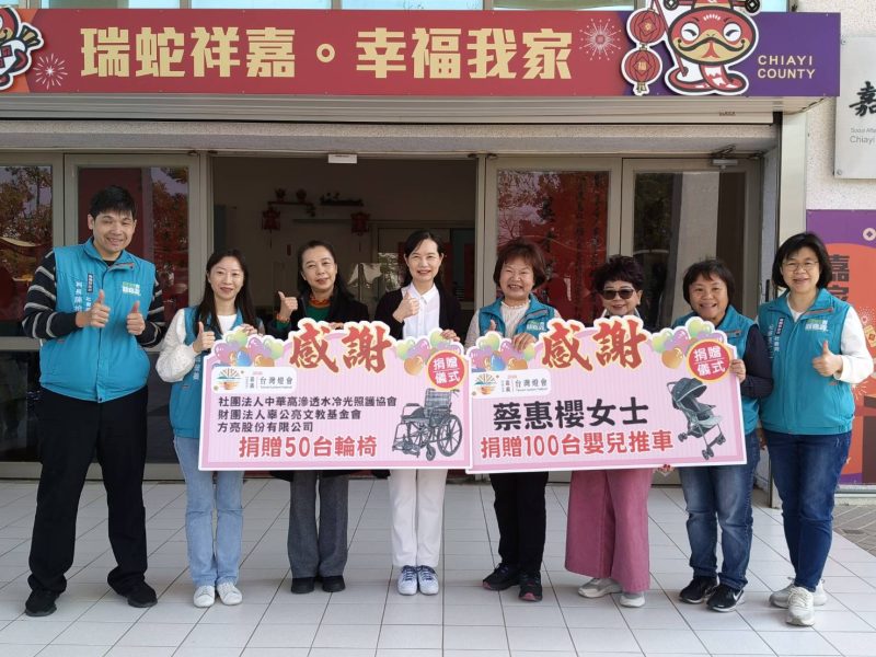 嘉義縣政府誠摯感謝社團法人中華高滲透水冷光照護協會的協助,以及財團法人辜公亮文教基金會、方亮股份有限公司所捐贈之輪椅,並感謝仁義湖岸大酒店董事長蔡惠櫻捐贈嬰兒推車,攜手為弱勢族群、育兒家庭與社會福利注入更多關懷與力量。
