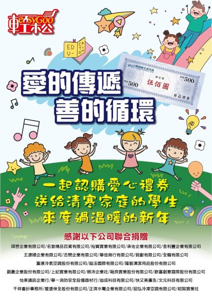 這次公益行動輕鬆購五金百貨贊助200名學童並且得到包括怡東通訊企業行、華一消防安全設備器材行、金利豐企業有限公司、琛懋企業有限公司、隆藝清潔用品股份有限公司、志閔企業有限公司、棋沛企業社、華信商行有限公司、快又美廣告、文元科技有限公司、千祥會計事務所、星堡保全股份有限公司等29家合作夥伴的大力支持,贊助總金額共30萬元。每位受助學生將獲得500元禮券,可用於購買學習與生活必需品,帶來實質的幫助與溫暖。