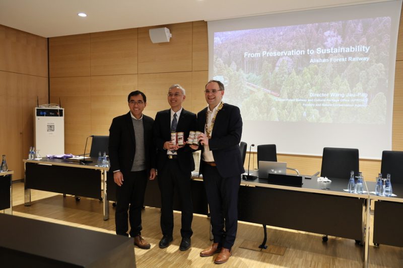 此次交流契機,源自周大觀文教基金會於2025年邀請「生命奉獻獎」得主造訪臺灣期間,實地走訪阿里山國家森林遊樂區與林鐵處交流。期間,Clemens Götz博士(德國Althengstett前市長)與Ryyan Alshebl(德國Ostelsheim市長)深刻感受到阿里山林鐵與自然環境融合共生之特色與價值;同時,透過《2421 公尺的迴聲:阿里山林鐵全線紀行》英文版一書,進一步理解42號隧道修復工程背後所面臨之工程挑戰、生態考量與決策歷程。
