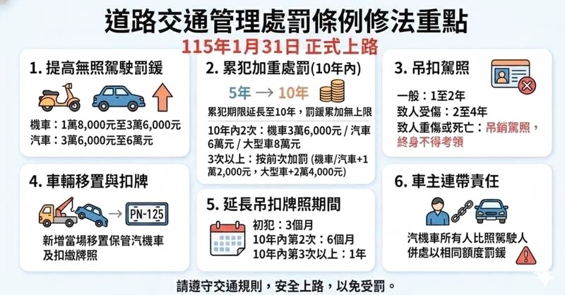一、無照駕駛罰鍰提高:無照駕駛罰鍰上限機車提高至新臺幣(以下同)3萬6000元,小型車提高至6萬元,大型車更是提高至8萬元。