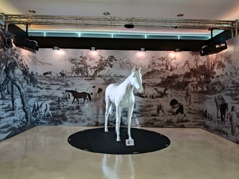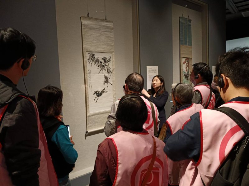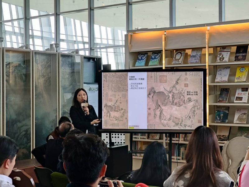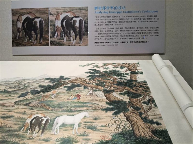 展覽中以郎世寧〈百駿圖〉為重要參照,透過相關圖像與說明,解析繪畫中融合西方透視與明暗渲染的手法,如何形塑畫面縱深與馬匹肌理,數位展示〈古畫動漫—百駿圖〉動畫展演呈現畫中駿馬的生態,與書畫文物形成有趣的對照;民國畫家馬晉於1923年摹繪〈百駿圖〉,以傳統工筆結合西洋明暗設色,展現近代畫家對宮廷畫風的再詮釋,亦反映「郎派」已被視為中國畫傳統的一部分。展覽並梳理歷代馬畫常見主題,如天馬、貢馬、瘦馬、番馬與人馬,呈現馬畫題材在文人精神與歷史境遇中的多重意涵。