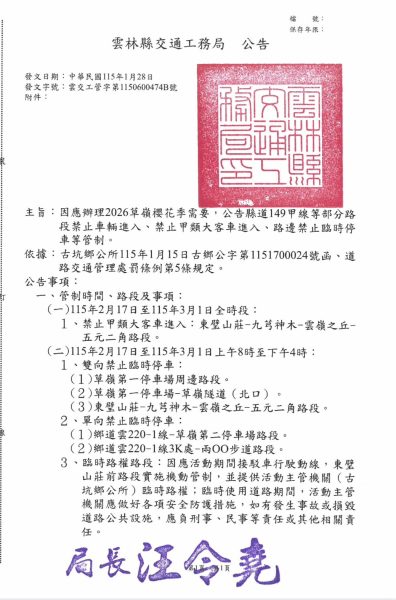 2026年草嶺石壁櫻花季將於2月17日登場,持續至3月1日,許多民眾到雲林縣古坑鄉草嶺石壁地區觀賞櫻花,為使各位遊客能夠開心出遊,雲林縣政府、古坑鄉公所與斗南警分局已做好交通疏運、接駁與環境整理計畫,迎接民眾到草嶺,享受浪漫精彩櫻之饗宴。