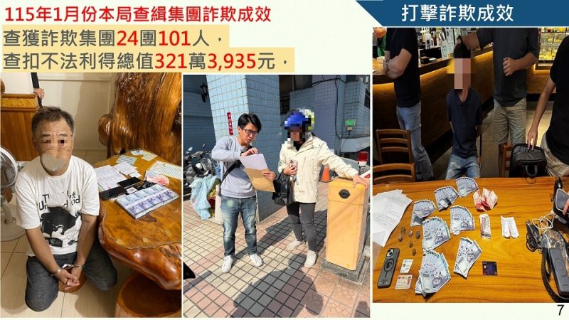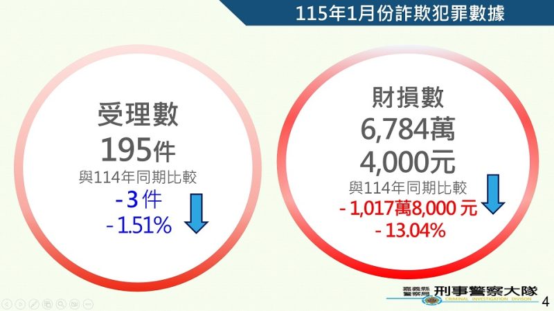 在打擊詐欺犯罪部分115年1月份查緝集團詐欺成效共查獲詐欺集24團101人,查扣不法利得總值321萬3,935元。攔阻詐欺件數部分,統計115年1月份則有22件、1,543萬8,829元,較 114年同期增加10件、1,040萬2,129元;在詐欺犯罪發生趨勢部分,根據打詐儀錶板分析,嘉義縣115年1月份詐欺案件受理數195件,財損金額新臺幣6,784萬4,000元,與114年同期數據相比較,受理件數減少3件 -1.51%)、財損金額減少1,017萬8,000元(-13.04%);另以行政區統計,民雄鄉(26件)、朴子市(25件)、太保市(21件)、中埔鄉(14件)、水上鄉(14件)為高發地區;