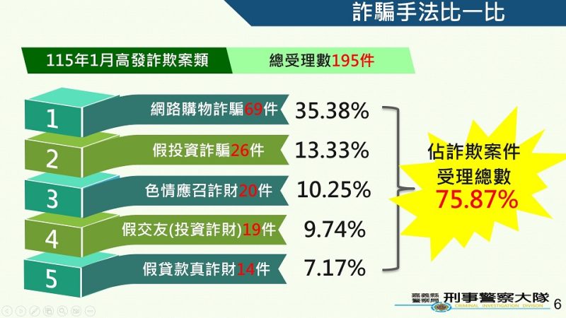 以詐騙手法分析,則以「網路購物詐騙」詐騙計69件最多(占35.38%)、「假投資詐騙」詐騙計26件次之(占13.33%)、「色情應召詐財」詐騙計20件再次之(占10.25%),網路購物詐騙案件已有明顯竄升趨勢,位居高發案類冠軍,惟投資詐騙(含假交友投資)在財損部分依然位居各類手法首位,占財損總額84.18%,提醒民眾投資前務必謹慎查證,切勿輕信不實廣告,以免誤墜詐騙陷阱!