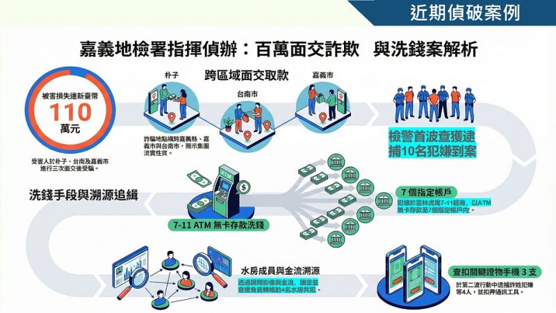 詐騙態樣層出不窮,嘉義縣警察局刑事警察大隊近期偵破溯源查緝詐欺集團水房成員案,緣於該大隊受理被害人所報遭詐欺案,於嘉義縣、台南市及嘉義市等面交三次損失新臺幣110萬元,經報請臺灣嘉義地方檢察署檢察官指揮偵辦,分別查獲車手及共犯等犯嫌10人到案。