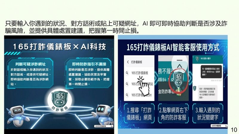 為提升民眾防詐能力,內政部警政署「165打詐儀錶板」再度升級,近期已正式導入AI智能防詐客服,只要輸入你遇到的狀況、對方話術或貼上可疑網址,AI即可即時協助判斷是否涉及詐騙風險,並提供具體處置建議,在此呼籲民眾多加利用,如遇可疑狀況、可疑對話或是可疑網址,均可求助於AI協助辨識,成功阻絕不肖詐騙犯嫌持續欺騙大眾。