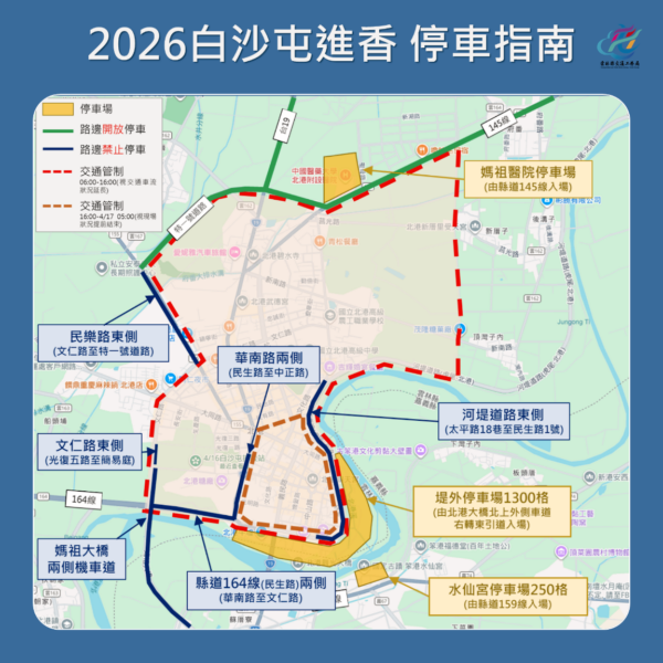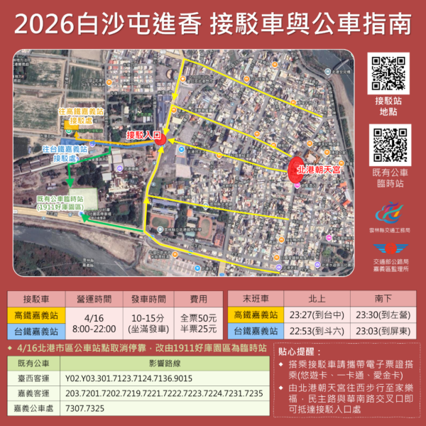在交通疏運方面,因應北港鎮內交通管制及可能壅塞情形,今年特別將既有公車臨時站調整至「北港1911好庫文化園區」。4月16日當天規劃開行286班次公車,主要服務雲林縣及嘉義縣市各鄉鎮往返北港之參拜需求。同時配合台鐵與高鐵時刻,當日8時至22時全面升級接駁服務,規劃北港往返高鐵嘉義站接駁車60輛、嘉義火車站接駁車70輛,並設置清楚動線指引,以提升整體運輸效率,確保人流順暢。在安全維護方面,縣府整合警察、消防及衛生單位資源,加強人潮分流與防踩踏機制,並成立「防踩踏專責小組」,於核心區域執行應變措施。現場將加派警力維持秩序,並於重要節點設置救護站與醫療團隊;另於北辰派出所規劃「緊急救護線」,以因應突發狀況,提供即時醫療支援,全力守護信眾安全。縣府也呼籲民眾配合現場交通及人流引導,共同維護活動秩序。相關交通配套措施,包括停車資訊、封路範圍及接駁車位置,將同步公布於縣府及警察局官網與社群平台,並建議民眾多加利用接駁車及收聽警廣掌握最新資訊。
