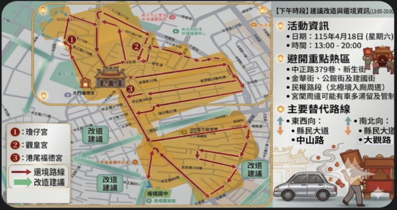 (一)避開重點熱區:當日活動期間,遶境隊伍將至上揭宮廟參拜,預計屆時宮廟周遭將出現車多、短暫滯留之狀況,且可能有間歇性交通管制。