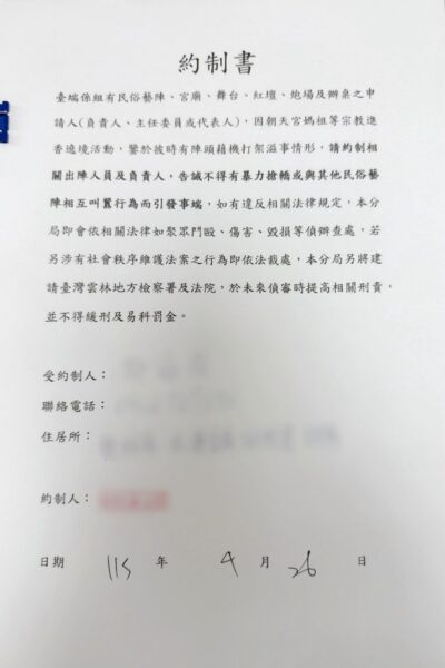 另針對遶境期間可能衍生之陣頭糾紛問題,警方也事先與各宮廟管理人員、民間團體及地方人士進行溝通協調,並簽訂約制書,要求各陣頭遵守秩序、理性參與,共同營造祥和慶典氛圍,致外界對遶境活動持正面肯定。