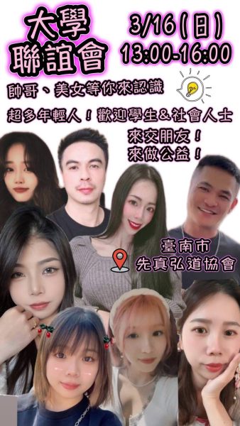 全國帥哥美女聯誼會、先真弘道協會-不肯去觀音聖誕,以做慈善公益為宗旨,將招募一萬位會員。訂於3月16日下午1點~4點,免費觀音占卜、漢服體驗