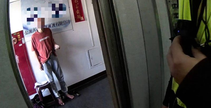 永康分局復興派出所11日接獲轄區大樓保全報案稱住戶發生糾紛,警方獲報到場電梯門一打開,卻見一名男子持刀對著自己腹部,員警見狀趁其不備上前奪刀,即時阻止一場意外發生。