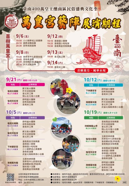擁有三百年歷史的臺南市南區喜樹代天府萬皇宮,今逢十二年舉辦一次的【三朝王醮大典】逐漸進入高潮。首先揭開序幕的是,由萬皇宮出資並邀請相關人士籌組的十八隊各具特色的藝陣,並與各交陪境宮廟一同舉辦「南區民俗文化藝陣展演」